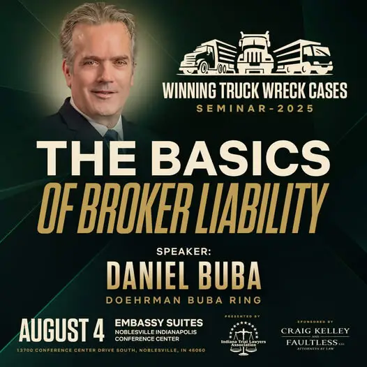 We are proud to highlight Daniel J. Buba, partner at Doehrman Buba Ring and Board Member of the Indiana Trial Lawyers Association (ITLA), as a featured speaker at this year’s Winning Truck Wreck Cases seminar. This premier event brings together some of the nation’s most respected trial lawyers to share strategies for successfully handling complex trucking litigation.